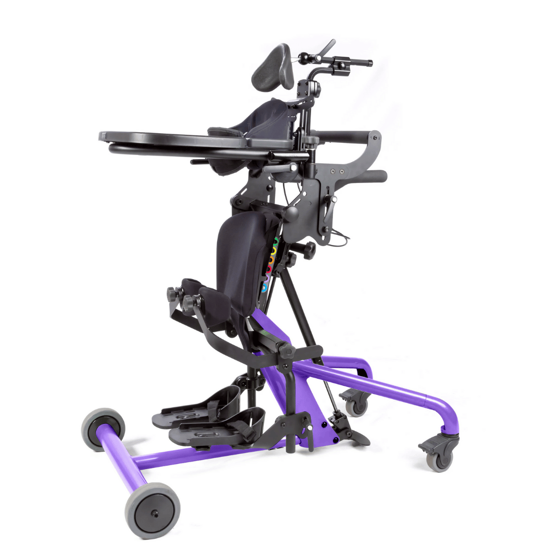 The Bantam is available in three sizes – Extra Small, Small and Medium – and offers limitless positioning options. Because changing positions in the Bantam is safe, easy, and quick, children using the Bantam can acquire a completely new perspective without the expense and time investment necessitated by a change of equipment. By regularly changing through a variety of standing positions, children are better able to stand for longer periods. The Bantam also makes it easier for caregivers to move the child to a standing position, and because children are more comfortable standing in the Bantam, they are likely to stand more often.