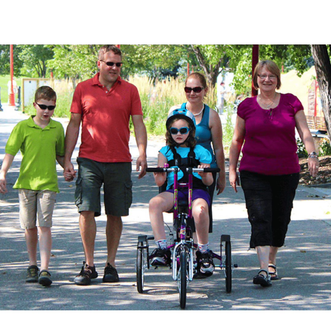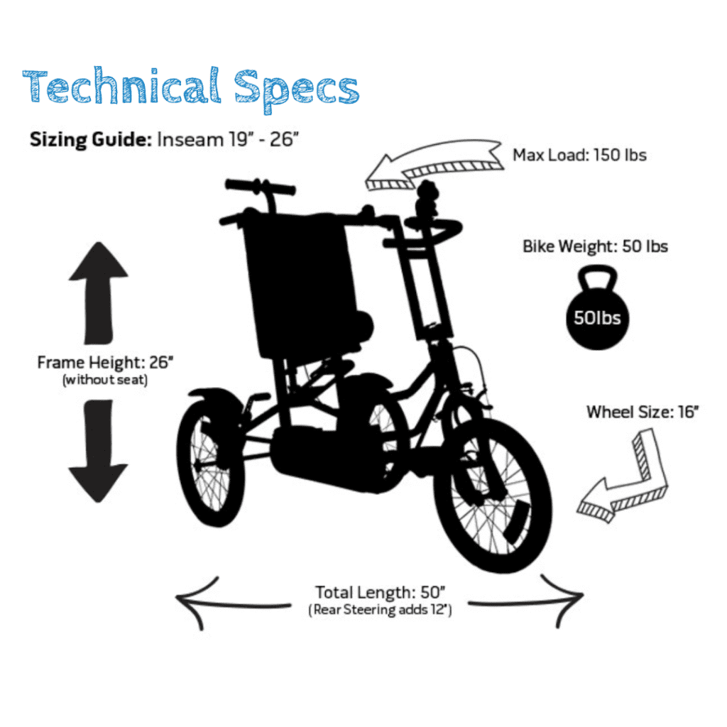 • T-Bar which can be used as a brake mount or caregiver handle – option to add Rear Steering so the rider can learn to ride and stop with a little help