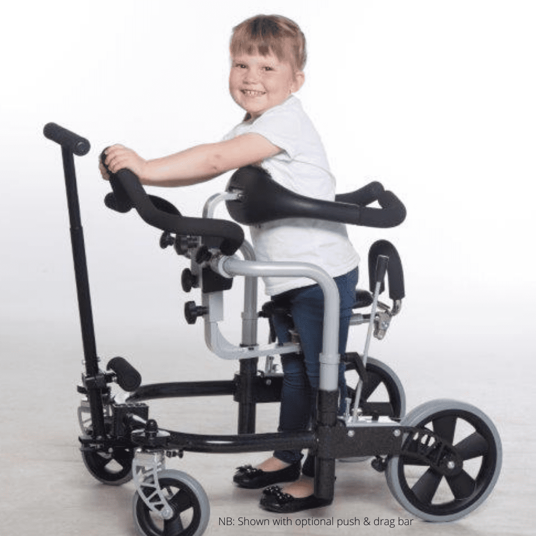 The user is not dependent on their forearms for weight-bearing, promoting social participation and enabling the person to eat/drink while using the gait trainer. The integrated hand bar is easily adjusted to fit the user if additional support is needed.