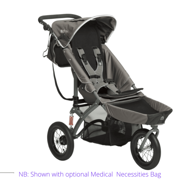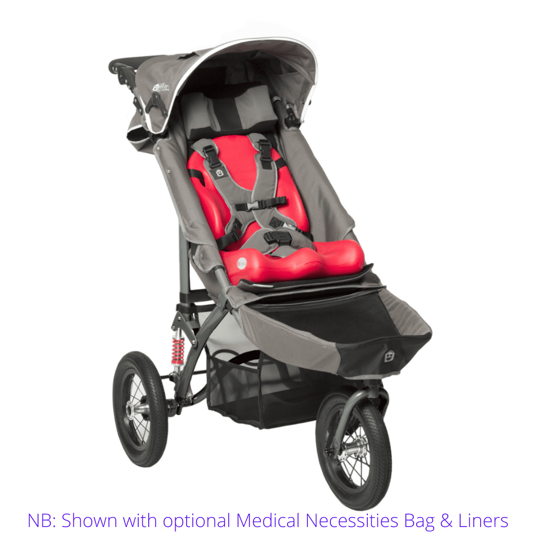 This special needs all-terrain jogging stroller comes standard with a functional rear suspension, ensuring a smooth ride over most surfaces. The swivel front tire makes manoeuvring in tight indoor spaces a breeze, too. For straight line strolling and rougher terrain, the front wheel can be locked inline easily.