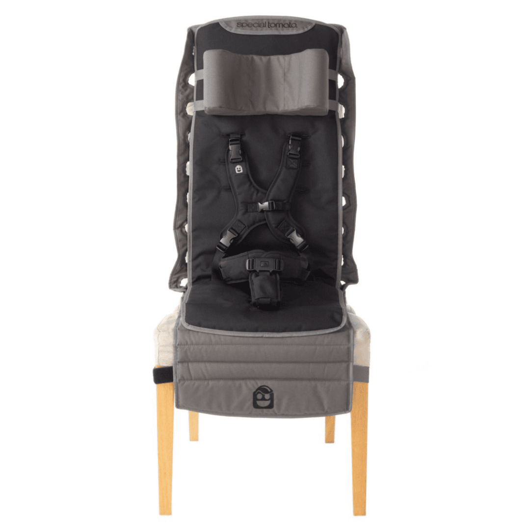 Until Now! Special Tomato has created the Out & About Seat (OAS) that provides comfortable upper body support using a padded, adjustable 8-Point Harness System and height adjustable Headrest. It will change where your family member with special needs can take a seat and remain comfortably seated while out with family and friends. The Special Tomato OAS can be attached to most standard, stable chairs that have a minimum seat back height of 14”. Once the child is properly seated, the 3-Point Pelvic Harness and 5-Point Chest Harness help to maintain a stable well-aligned position of the pelvis and trunk. Slots are available at 5 different heights on the base fabric back for the threading of shoulder straps. This ensures proper angle of pull and accommodates for growth of the child. The adjustable height headrest promotes a midline position of the head. When a child is properly supported in a well-aligned upright sitting position, energy that would have gone to squirming to get comfortable or just to maintain a sitting position can now go to attending to and participating in the experience they can be included in.