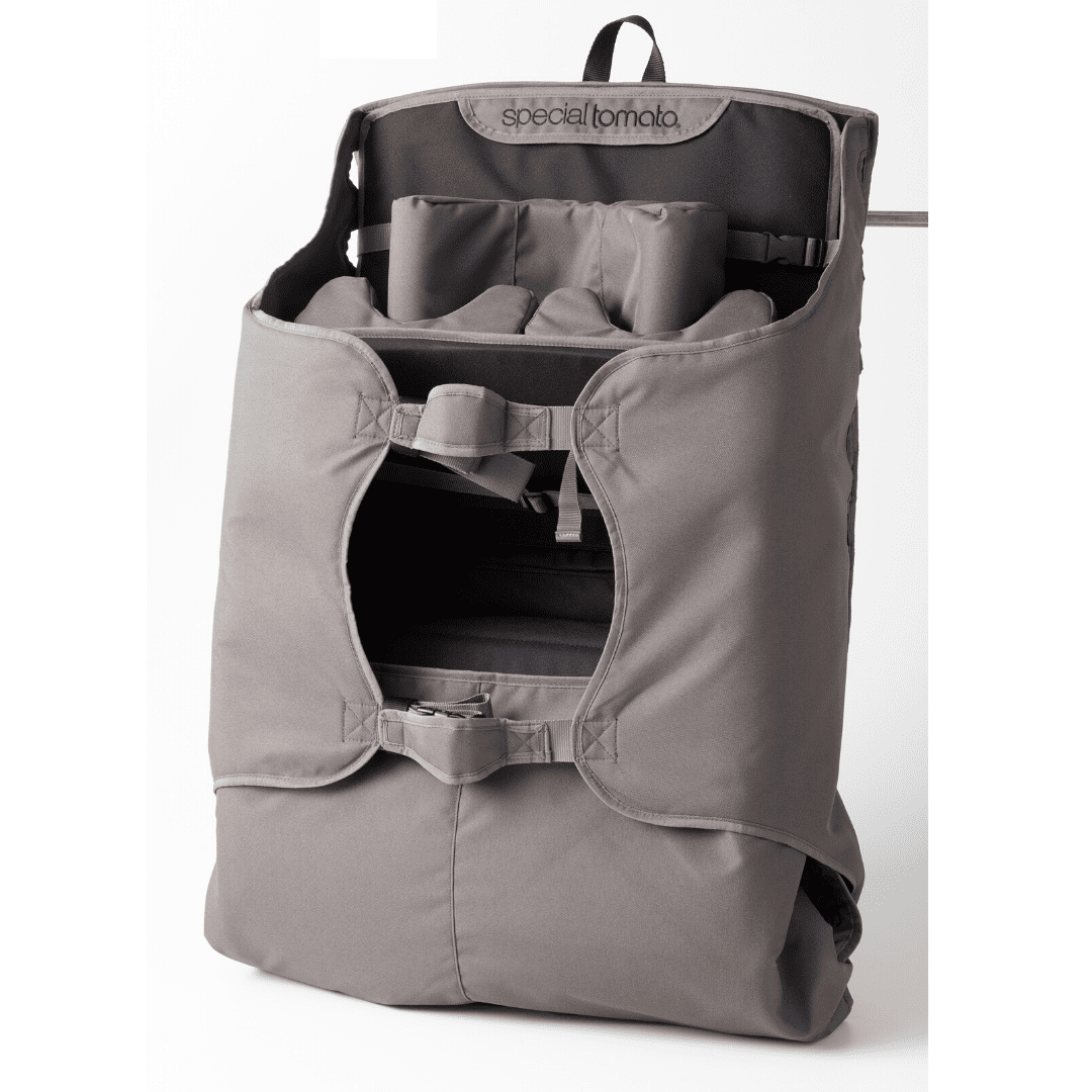 Another great feature, the Special Tomato Recliner Support System is completely portable and easy to store. It folds and clips like a suit bag and has a handle which can be used to hang it from a standard coat hook on the back of a closet door or wall. The RSS weighs only 10 lbs. It’s perfect to bring along on a visit to someone else’s house too!