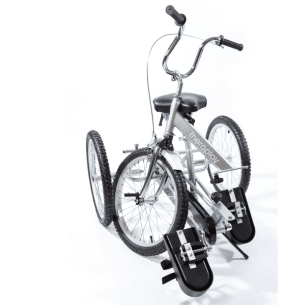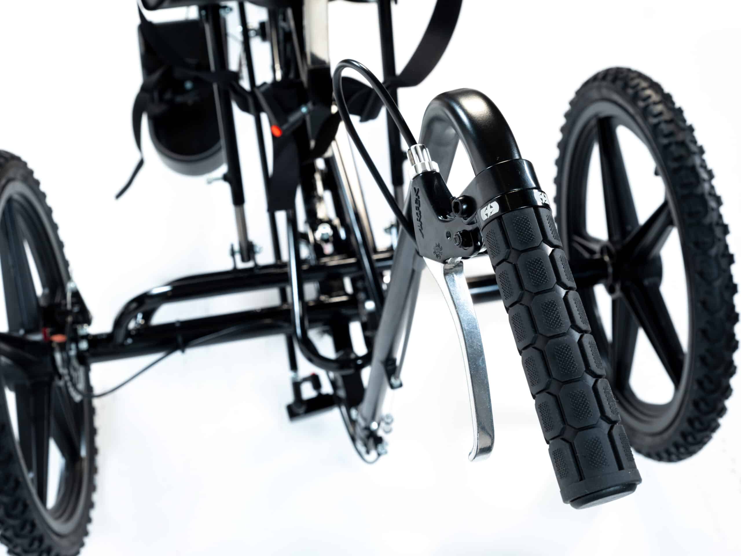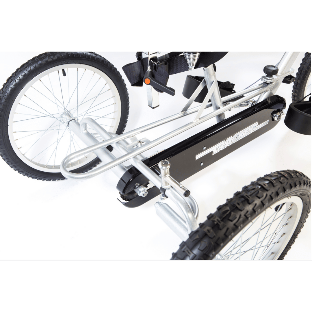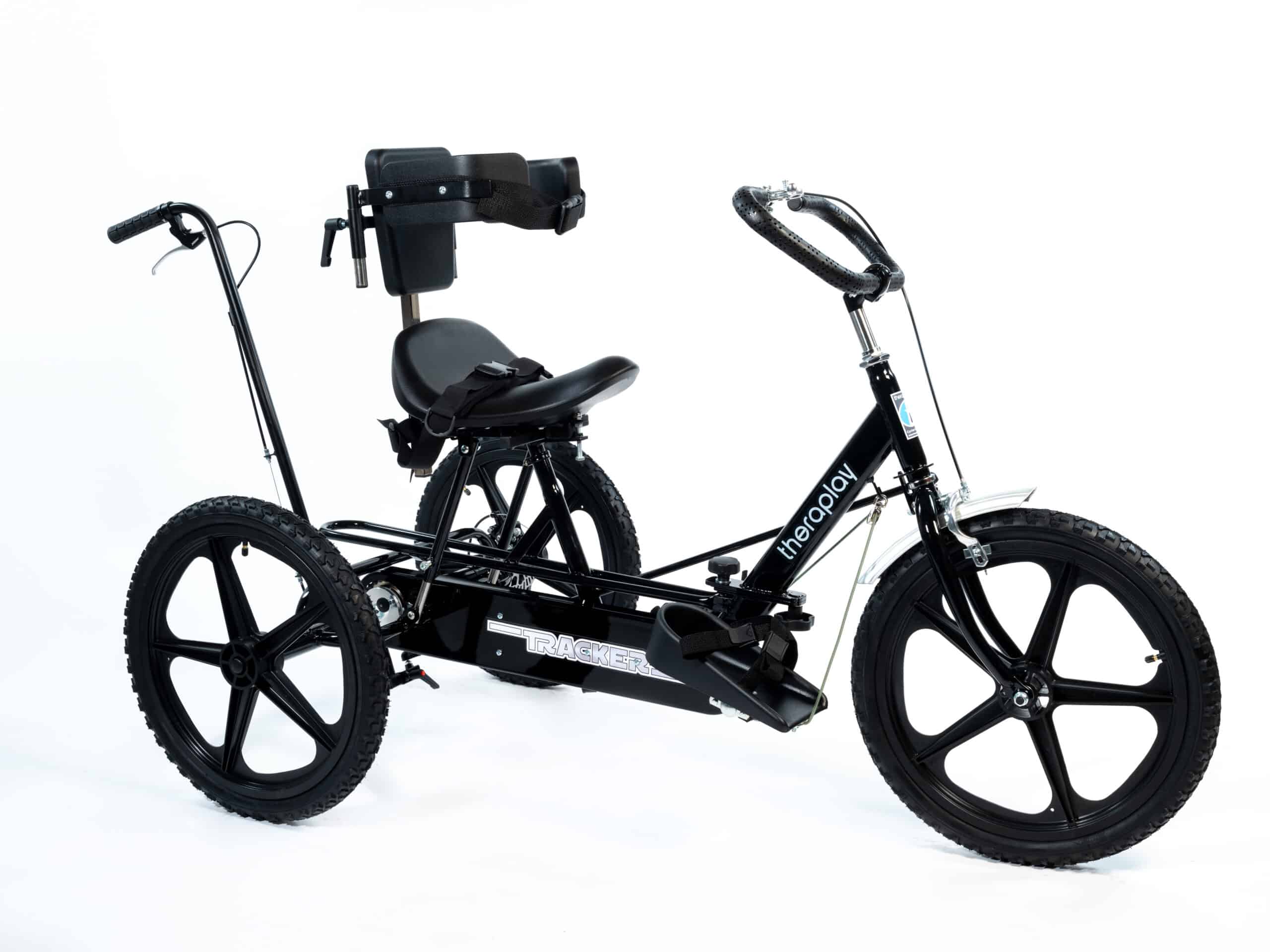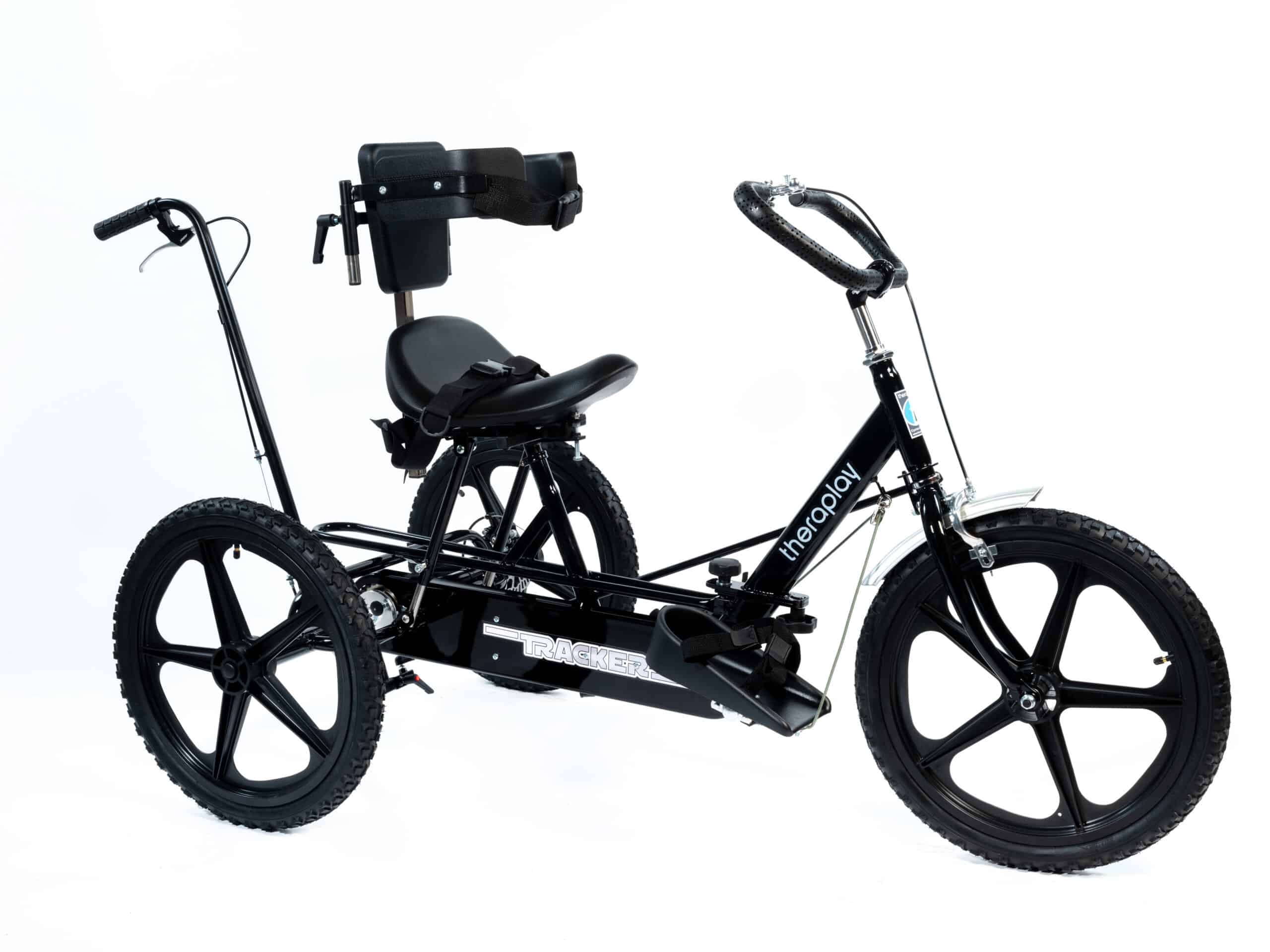The low gear ratio makes it easy to get going, it also limits the top speed to enable the rider to stay in control. The gear ratio can be changed to suit the rider’s pedalling ability. This model is fitted with a Fixed Gear which enables the rider to pedal forwards and backwards and to slow or stop the cycle without using the brake lever, it can also be fitted with an Option Drive Gear. The Tracker 20″ model can be fitted with various saddle options and postural supports for the rider. If additional guidance is required, this model can be fitted with either a Control Pole or a Rear Steering System.