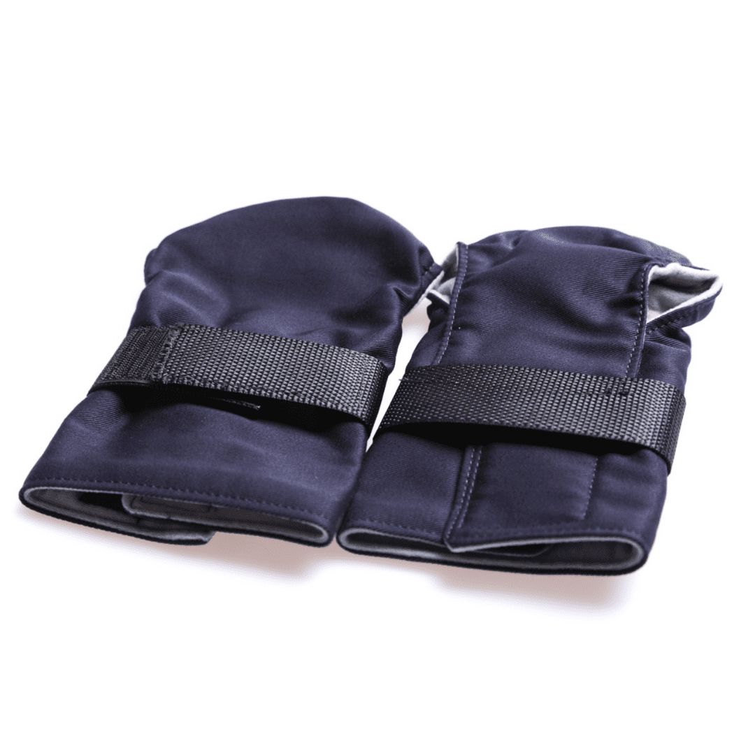 Junior mittens, in strong blue Beaver nylon outside fabric and soft polyester inside is shaped for right or left hand to follow fingers nicely and help grip bike handlebar, walker or crutches.