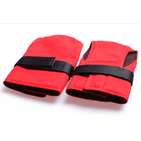Children assistance mittens in red Beaver nylon with right and left side model to secure that fingers position and grip on crutches, handle bar or walker are easily maintained.